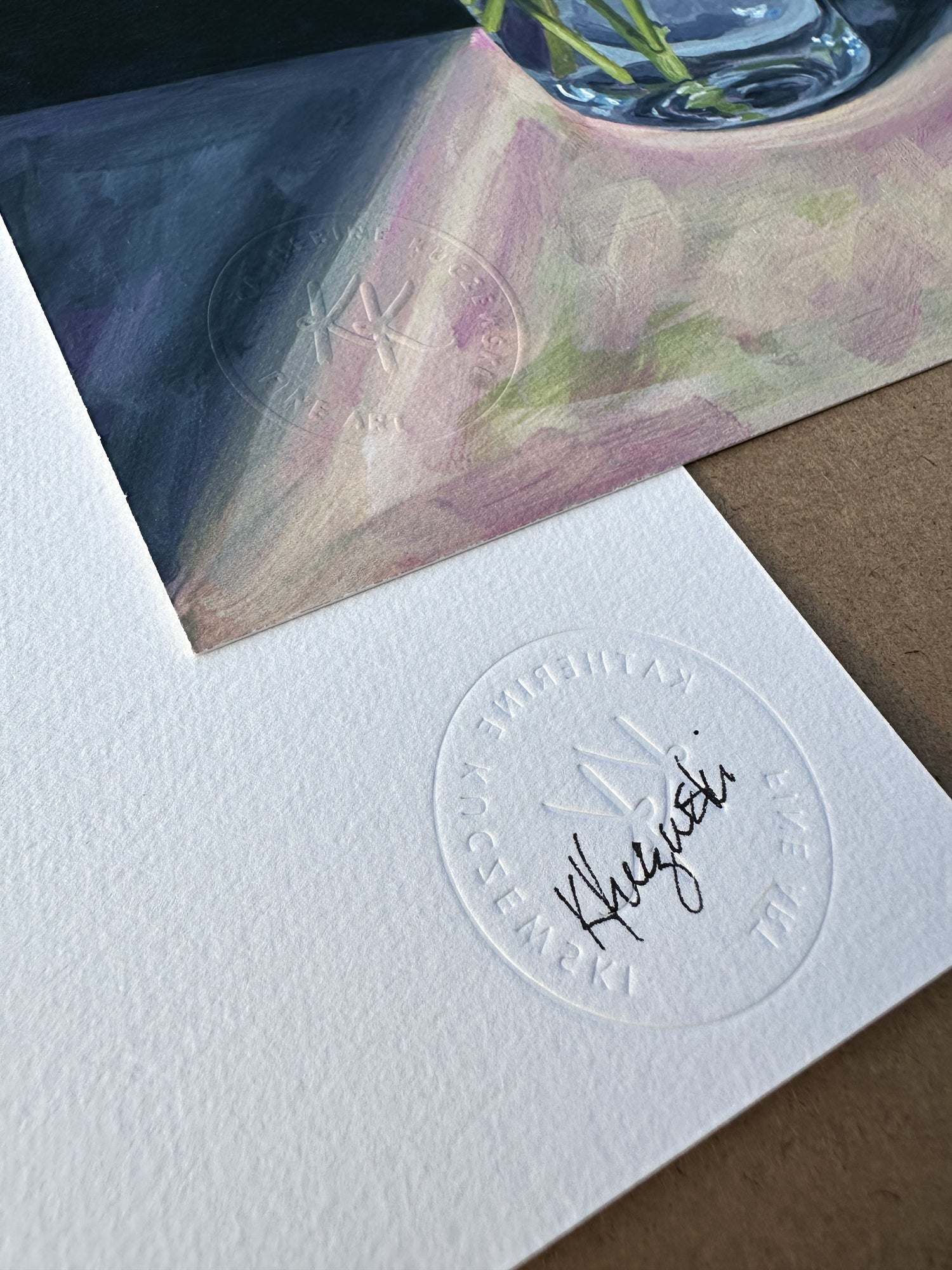 The collection is printed on a 340 gsm 100% cotton rag paper that has a texture and warm color tone similar to my original acrylic painting.