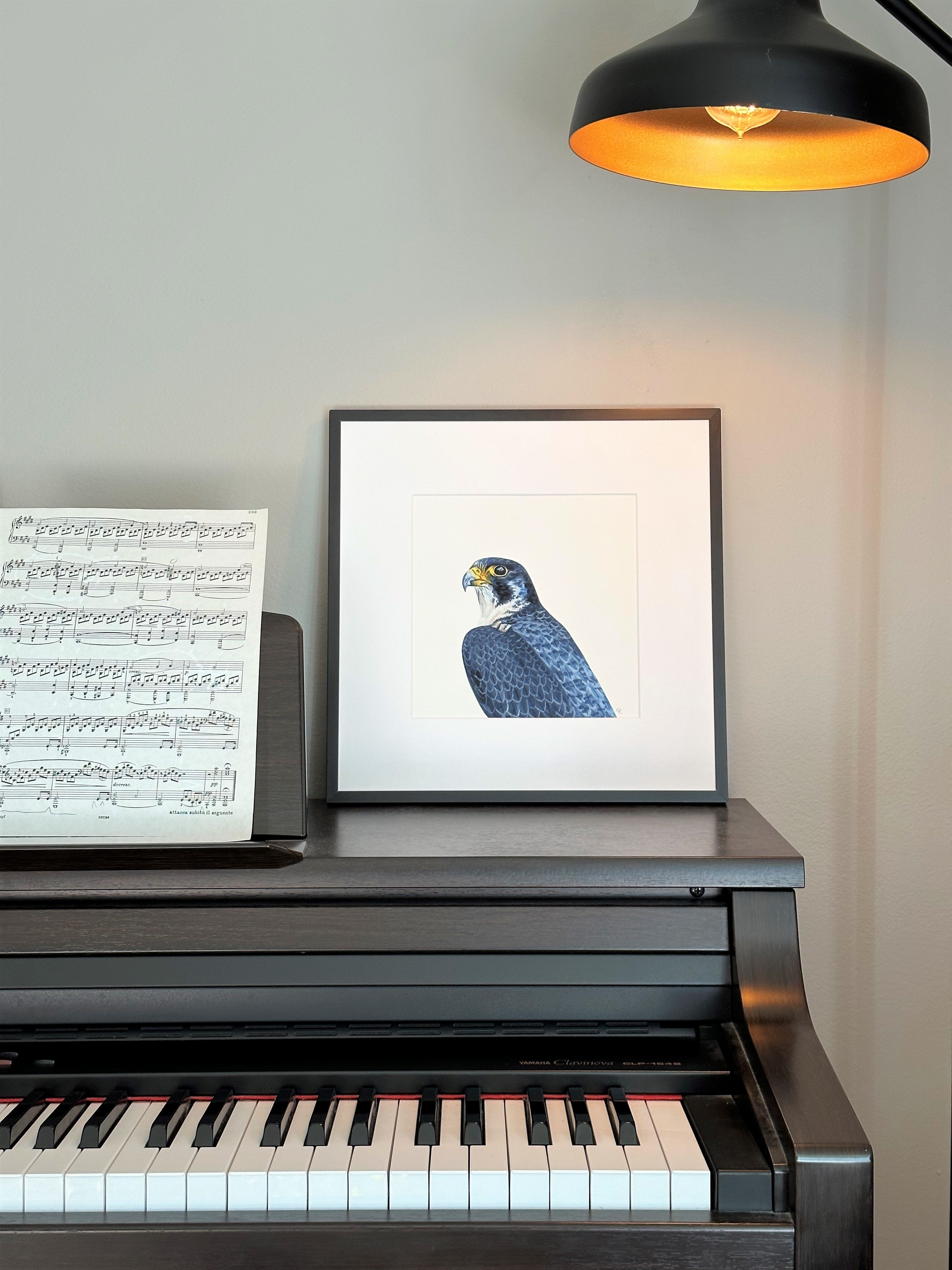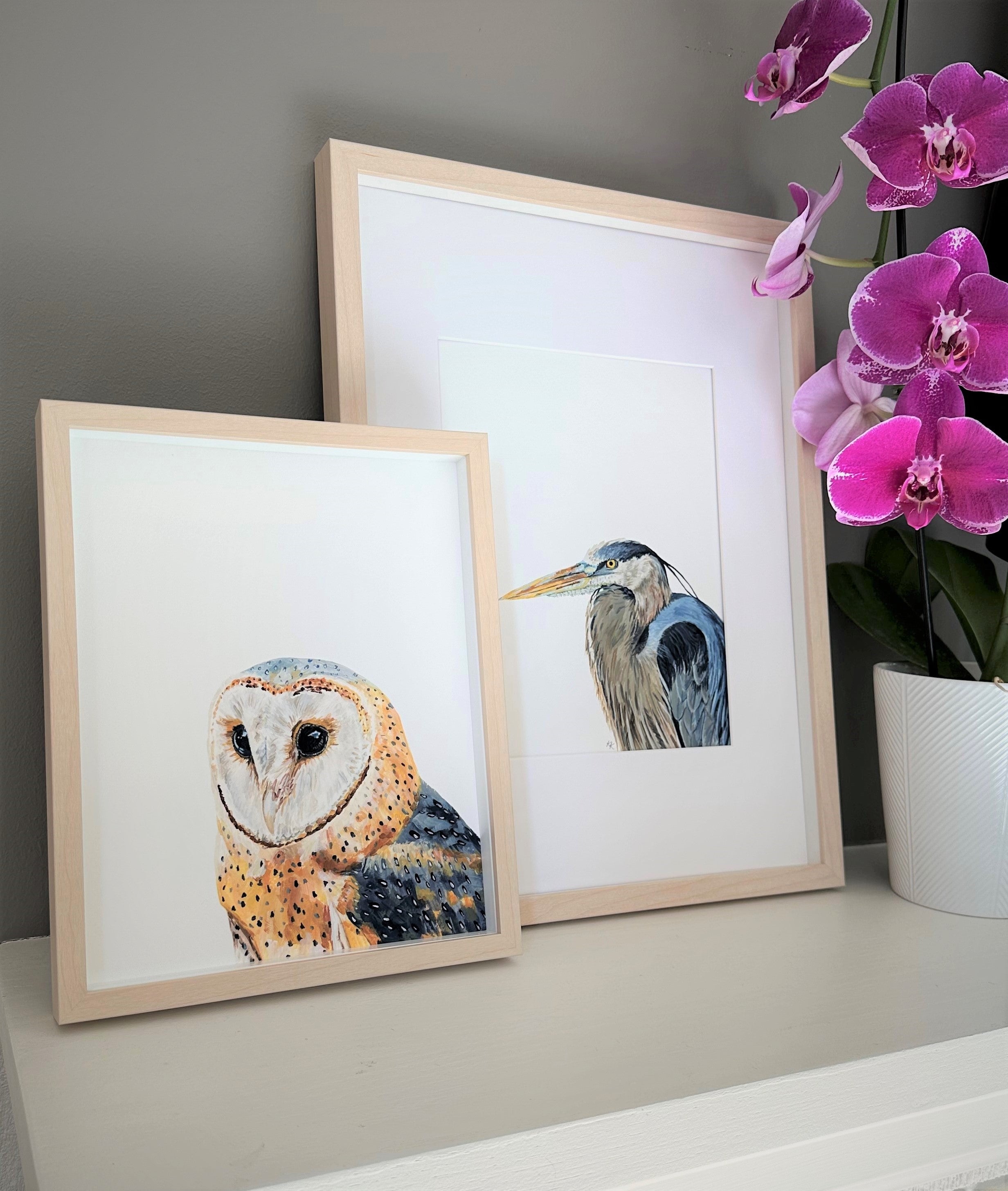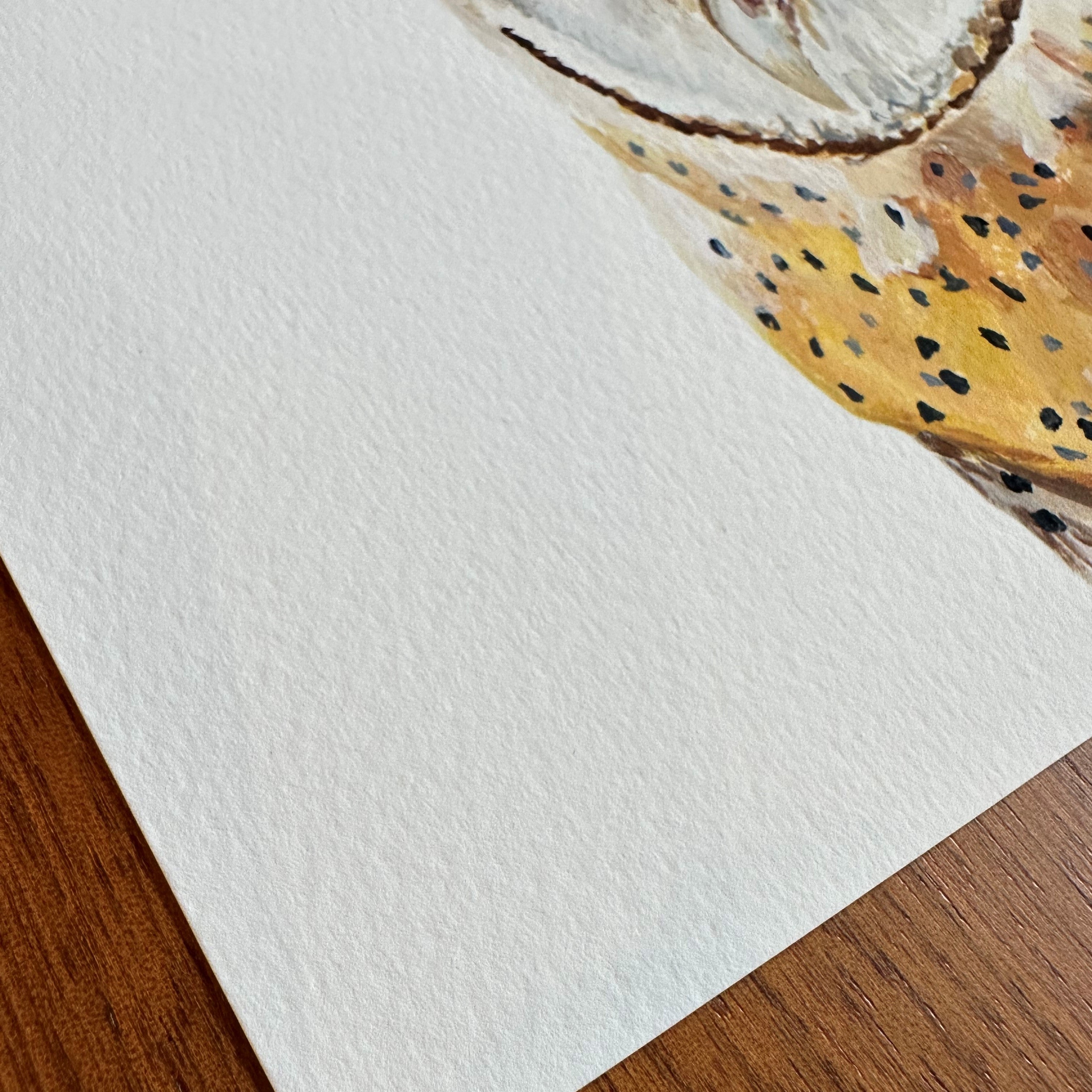To achieve high-quality reproductions of the original paintings, my studio uses an archival museum-grade method of printing known as giclée. The Birds of a Feather collection is reproduced on a cold press natural 100% cotton rag media with a heavy weight of 340 gsm, free of acid, lignin, chlorine, and optical brightening agents. The media has a natural warm tone with a lovely texture that looks and feels like the original painting.