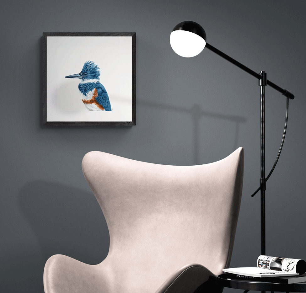 To achieve high-quality reproductions of the original paintings, my studio uses an archival museum-grade method of printing known as giclée. The Birds of a Feather collection is reproduced on a cold press natural 100% cotton rag media with a heavy weight of 340 gsm, free of acid, lignin, chlorine, and optical brightening agents. The media has a natural warm tone with a lovely texture that looks and feels like the original painting.