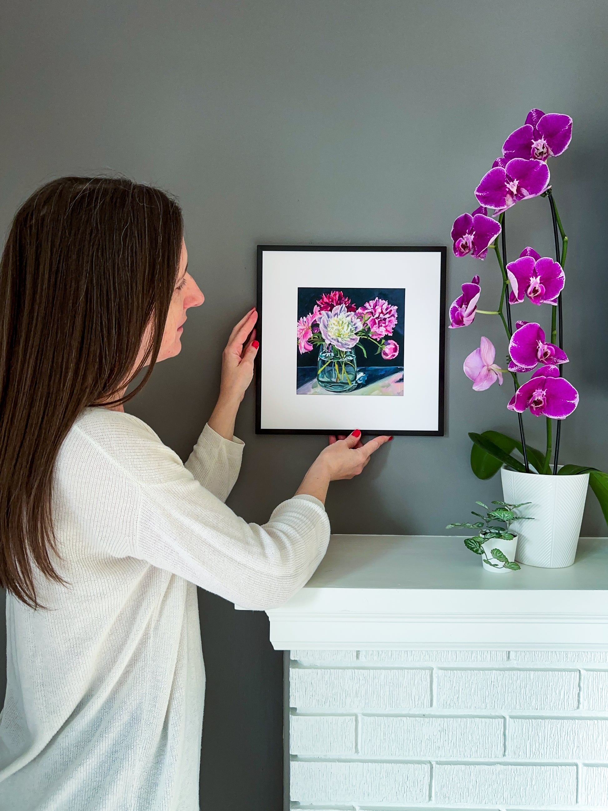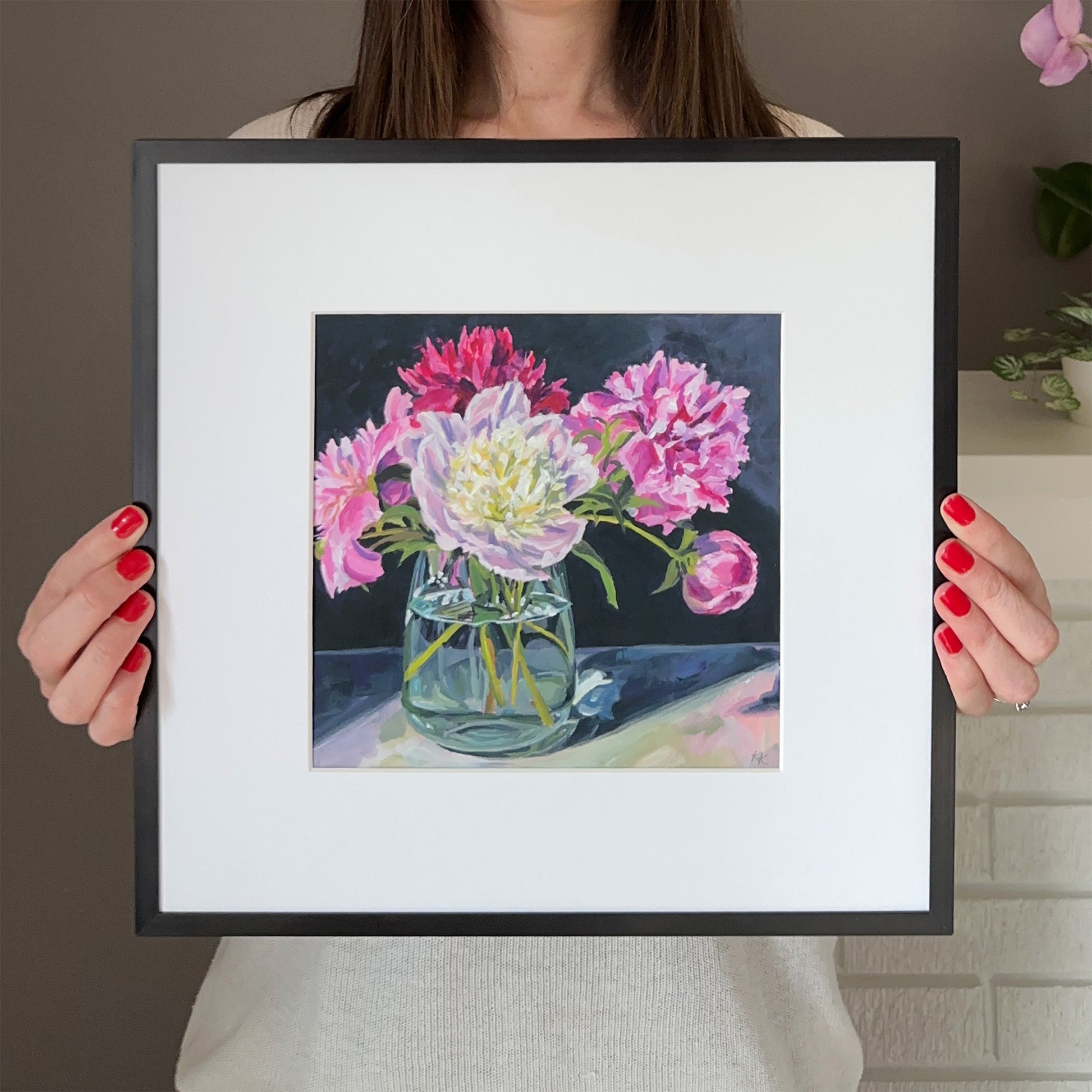 To achieve high-quality reproductions of the original paintings, my studio uses an archival museum-grade method of printing known as giclée. The Peony collection is reproduced on a cold press natural 100% cotton rag media with a heavy weight of 340 gsm, free of acid, lignin, chlorine, and optical brightening agents. The media has a natural warm tone with a lovely texture that looks and feels like the original painting.