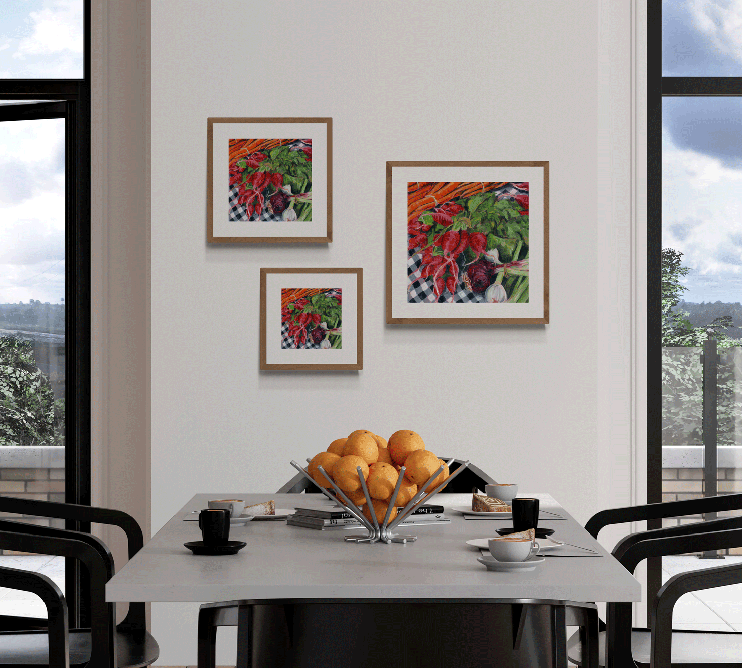 To achieve high-quality reproductions of the original paintings, my studio uses an archival museum-grade method of printing known as giclée. The Still Life collection is reproduced on a cold press natural 100% cotton rag media with a heavy weight of 340 gsm, free of acid, lignin, chlorine, and optical brightening agents. The media has a natural warm tone with a lovely texture that looks and feels like the original painting.