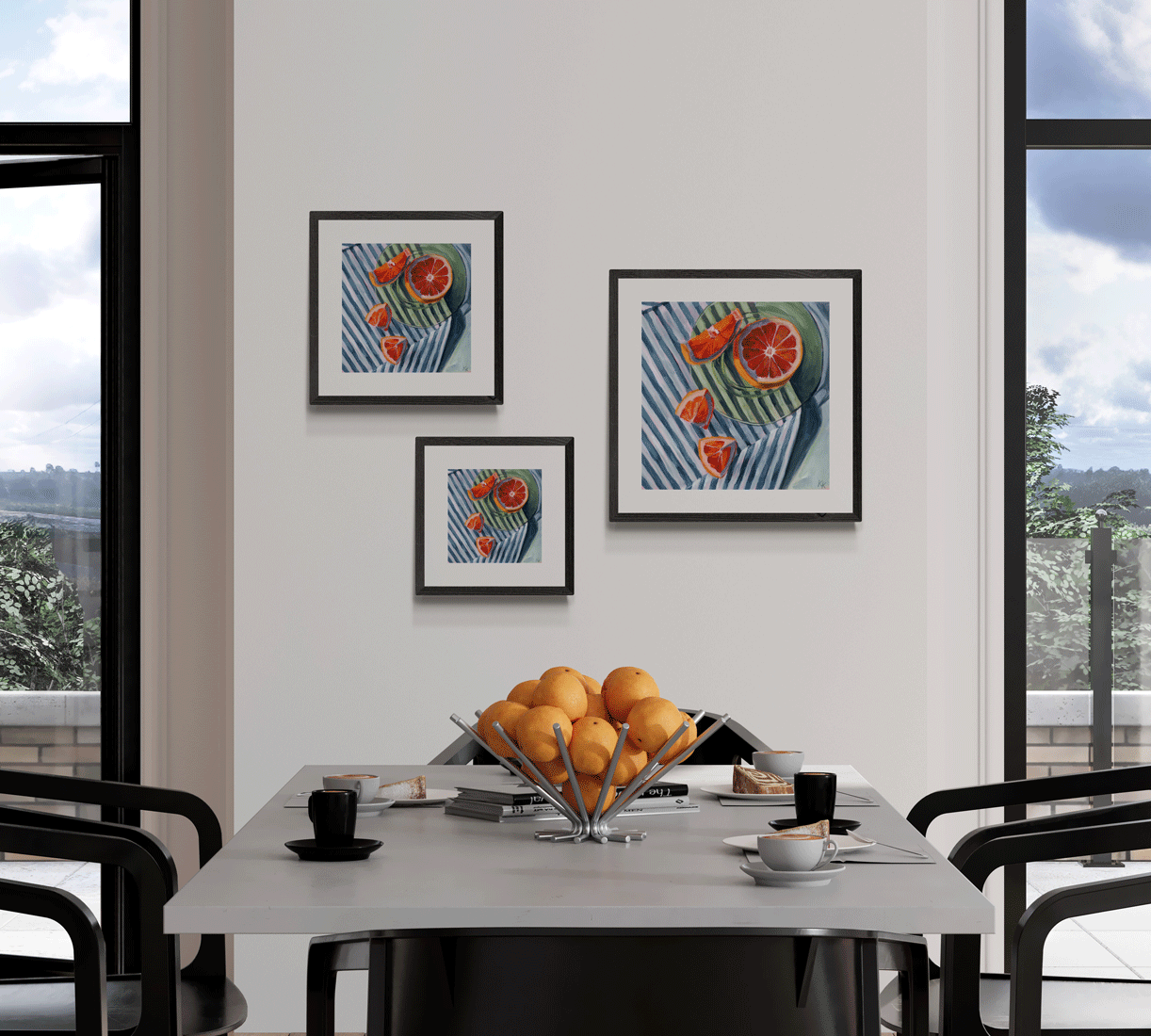 The Still Life collection is reproduced in a museum-grade giclée print featuring cold press natural 100% cotton rag media with a heavy weight of 340 gsm. The media has a lovely texture and great color rendition.